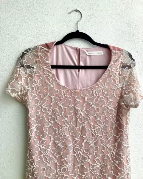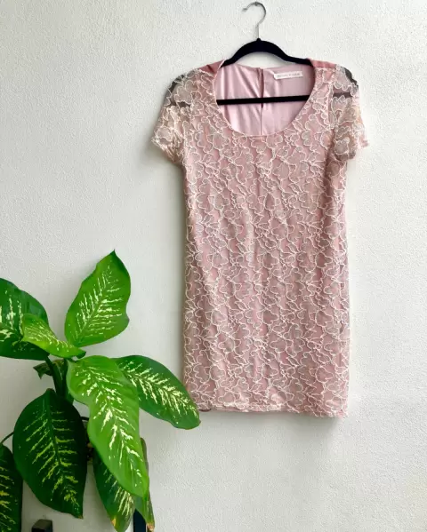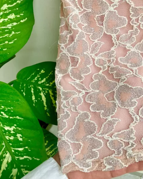 Vestido color rosa nude con detalles bordados o de encaje en color plateado, se amolda al cuerpo y tiene forro. Es muy bonito para un evento en la tarde.