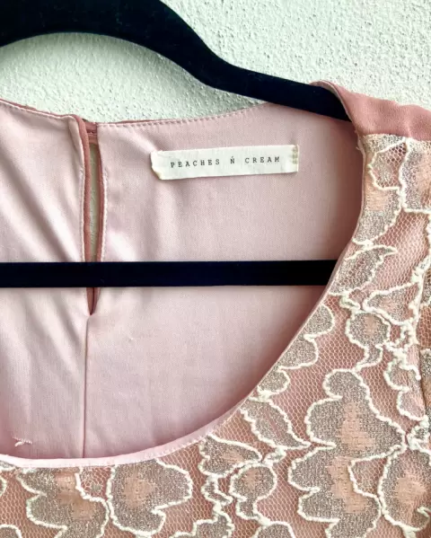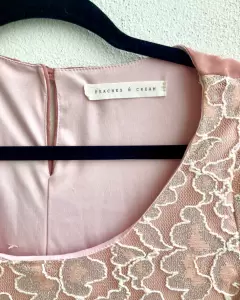 Vestido corto. Vestido color rosa nude con detalles bordados o de encaje en color plateado, se amolda al cuerpo y tiene forro. Es muy bonito para un evento en la tarde.