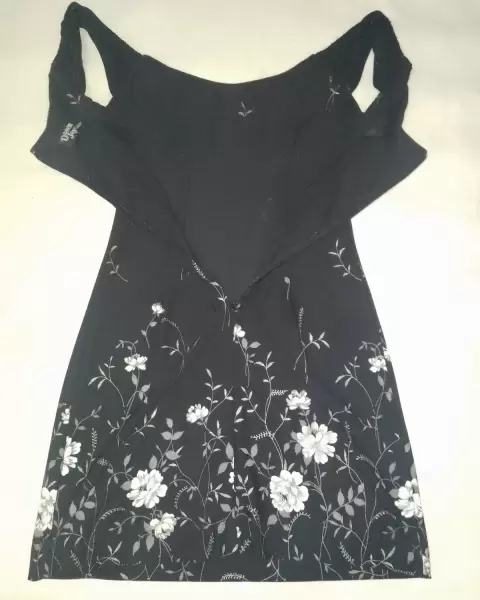 Vestido corto de poliéster con tirantes un poco con resorte, cierre en la parte de atrás muy resistente a abrirse por más apretado que esté.