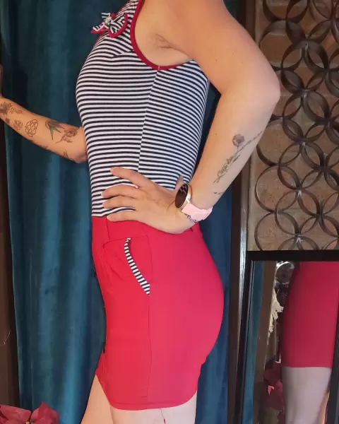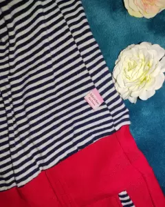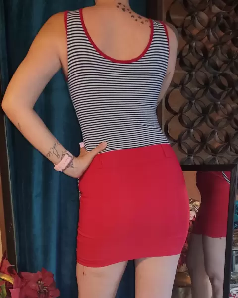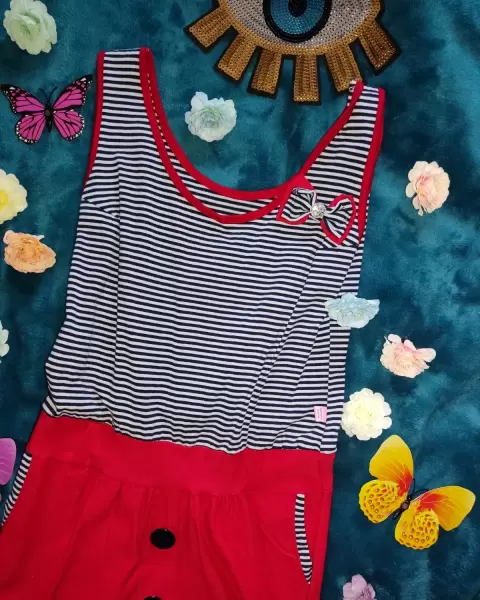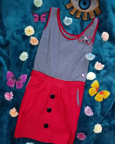 Hermoso vestido corto a rallas azul con blanco la parte de arriba y la falda roja con botones grandes de adorno azules, queda pegadirto para lucir súper Sexy.Envío el día de tu compra ( de lunes a sábado) en horario que esté abierta la paquetería.