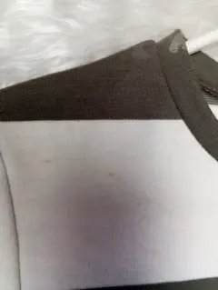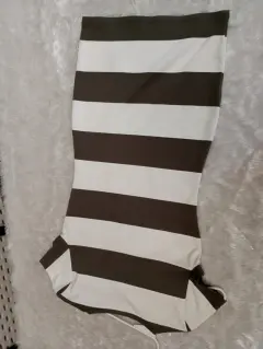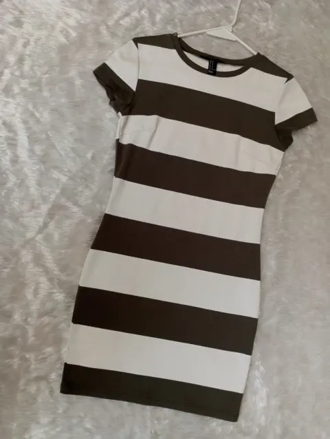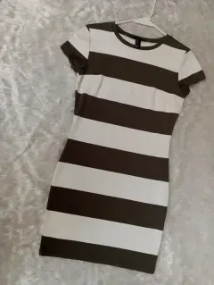 Vestido corto, ceñido, manga corta, cuello redondo, a rayas horizontales. Mide de hombro a hombro 37 cm, del hombro hacia abajo 79 cm, de axila a axila 41 cm y 70 cm de circunferencia de la cintura. La tela estira. Tiene dos pequeñas manchas en el hombro.