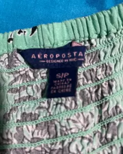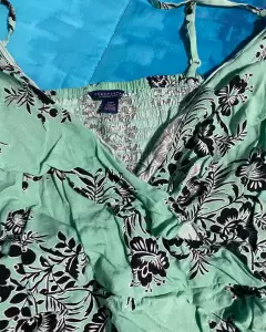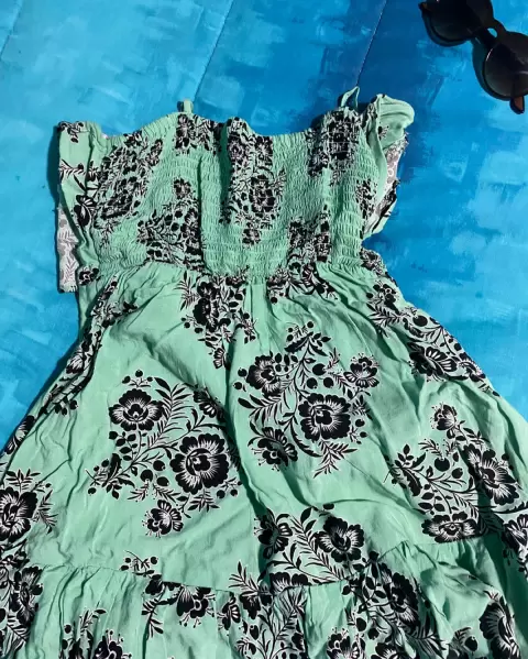 Vestido corto tipo playa con Olanes, es chico pero también queda para una talla mediana, tiene resorte en la espalda.