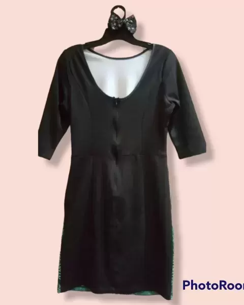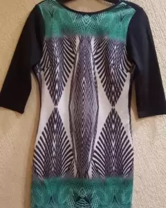 Lindo vestido corto de algodón stretch, multicolor de enfrente y negro atrás, de manga 3/4 y con escote discreto en espalda.Marca Andrea pero le corté la etiquetaporque me raspaba* Talla M**Producto lavado*Sin detalles**Calificación: 10**GRACIAS POR TU PREFERENCIA*