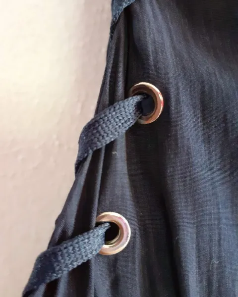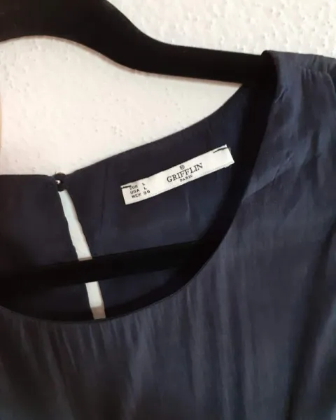 Bonito vestido corto color azul marino con ojillos metalicos en manga para ajustar, el color es firme. Es talla grande pero la recomiendo para talla M.