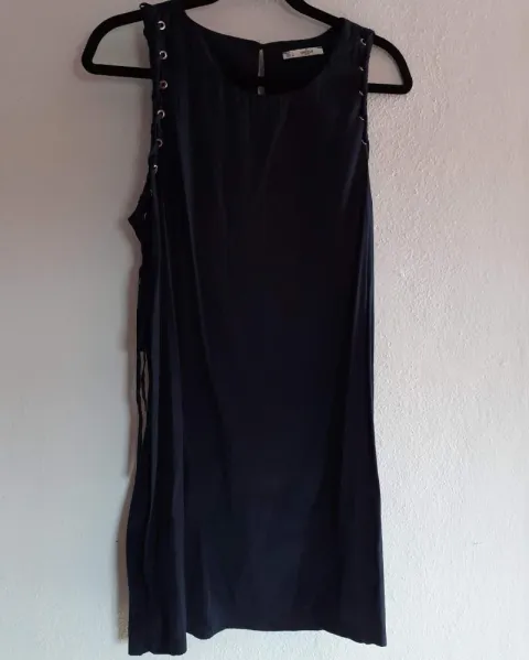 Vestido Corto Azul. Bonito vestido corto color azul marino con ojillos metalicos en manga para ajustar, el color es firme. Es talla grande pero la recomiendo para talla M.