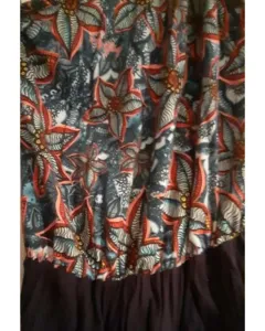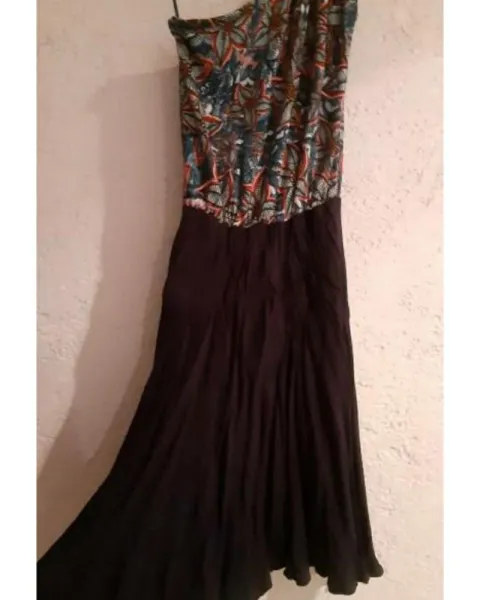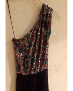 Vestido corto azul con flores.. Tela estrech, de un solo hombro, largo aproximadamente a la rodilla.