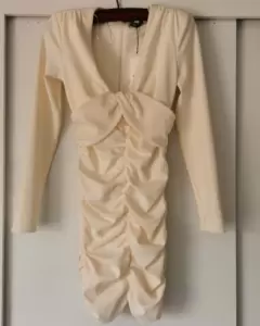 VESTIDO CORTO BLANCO DRAPEADO ZARA. Vestido corto drapeado, con forro y hombreras.Se ajusta muy bien al cuerpo y forma linda figura.