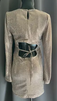 Vestido corto brillante. Hermoso vestido de brillos. Está forrado por dentro. Se ajusta en la espalda con una cinta. La parte de atrás puede quedar un poco floja pero la puedes ajustar con unas puntadas.La tela no estira pero se adapta muy bien al cuerpo