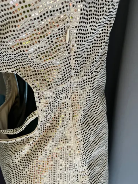 Hermoso vestido de brillos. Está forrado por dentro. Se ajusta en la espalda con una cinta. La parte de atrás puede quedar un poco floja pero la puedes ajustar con unas puntadas.La tela no estira pero se adapta muy bien al cuerpo
