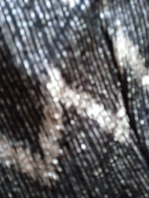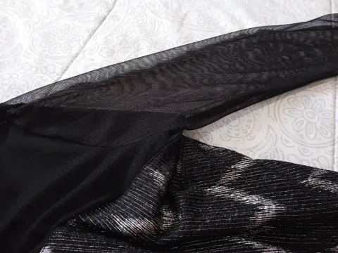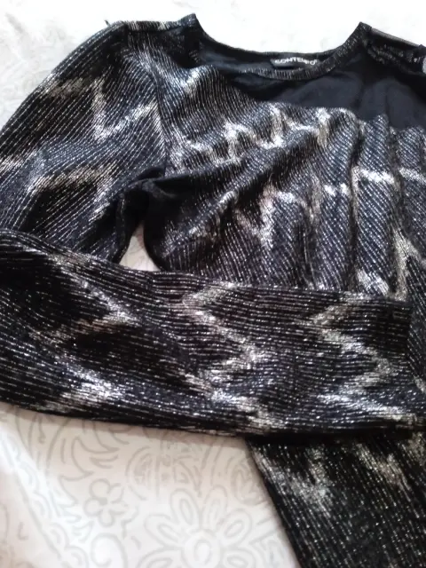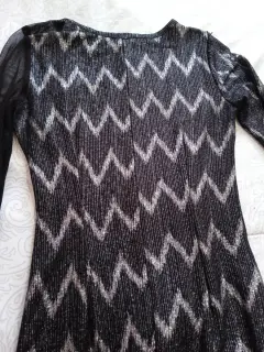 Vestido corto brilloso. Talla mediana, strech, largo de la cintura a la pierna 38 cm,largo de manga 53cm,cintura 75 cm, medida de cadera 96cm.