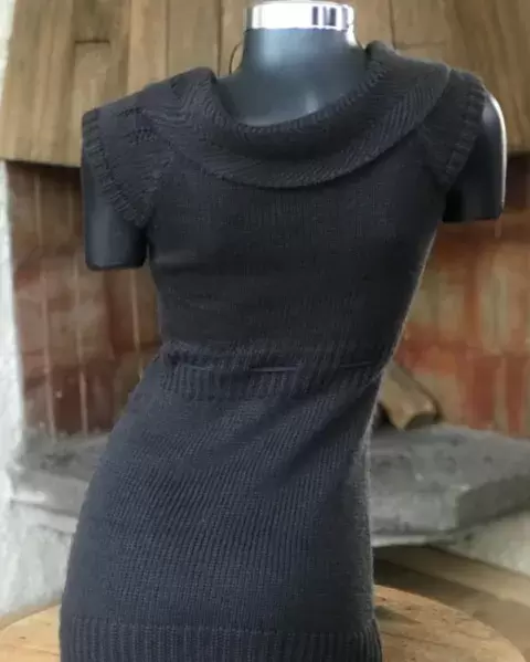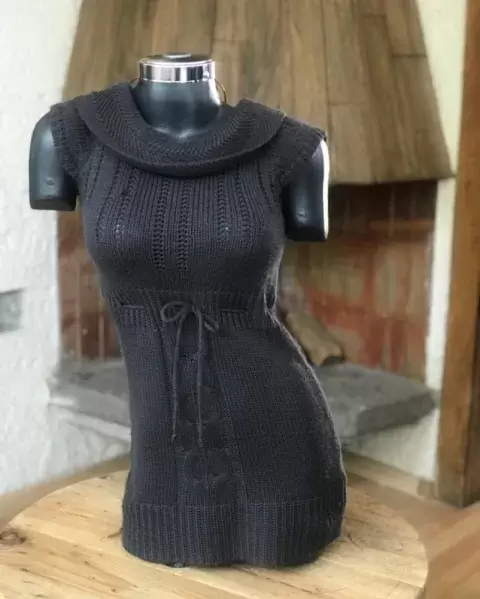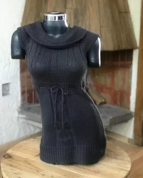 Precioso vestido tejido de punto es talla mediana pero viene reducido si podría quedar a las dos tallas lo puedes combinar con zapato formal botas largas botines está en perfecto estado en la usé como tres veces nada más
