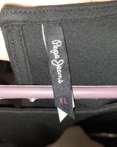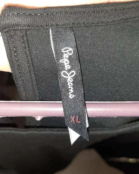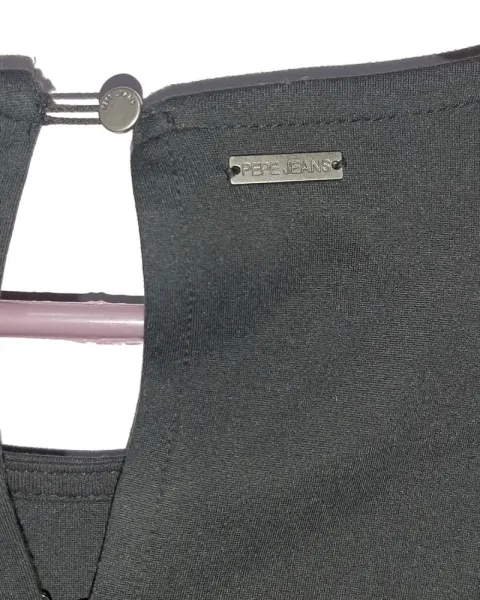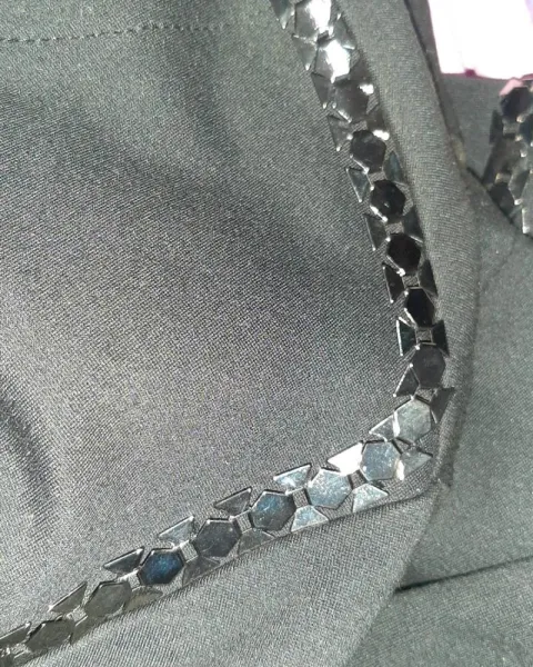El vestido es negro y corto con mangas largas, de tela gruesa y el controno cuenta con un contorno plateado