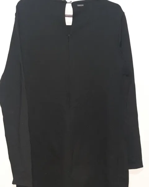 Vestido corto casual. El vestido es negro y corto con mangas largas, de tela gruesa y el controno cuenta con un contorno plateado