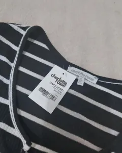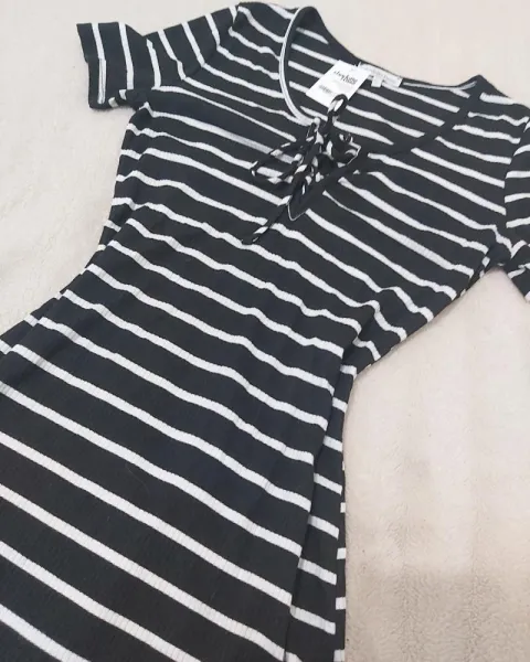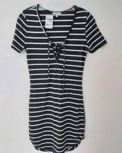 Vestido corto pegado de rayas, strechTela suave y frescaNuevo en excelente estadoTiene bonito detalle de cintas en la psrte del pecho