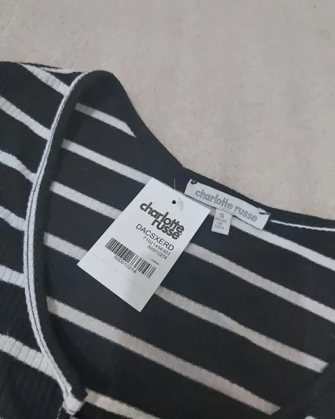 Vestido corto charlotte russe. Vestido corto pegado de rayas, strechTela suave y frescaNuevo en excelente estadoTiene bonito detalle de cintas en la psrte del pecho