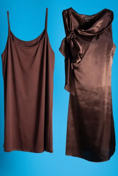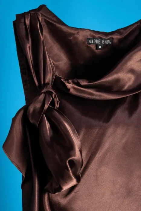 Vestido corto color chocolate. Vestido corto sin mangas, sin cierre ni botones, cuello, fondo independiente, color chocolate, tela satín, Talla M. Ideal para eventos en jardín.