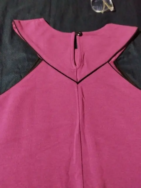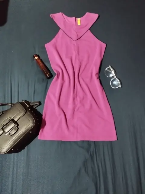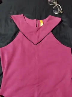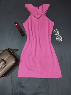 Vestido color magenta con detalles negros en el cuello y mangas, se encuentra en perfecto estado, la tela estira y se amolda a la figura, botón en la parte posterior del cuello, escote tipo halter