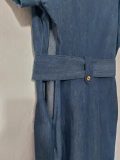 Luce muy belloTe va a encantar.Talla SEn buen estado y sin detallesNo tiene strech. Fiel a su talla.Incluye cinturón.Tiene cierre al costado.Tela tipo mezclilla.De axila a axila: 45 cmLargo: 83 cm.