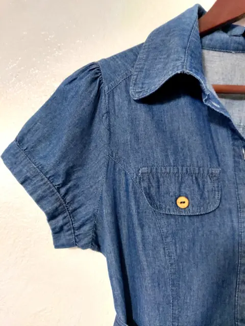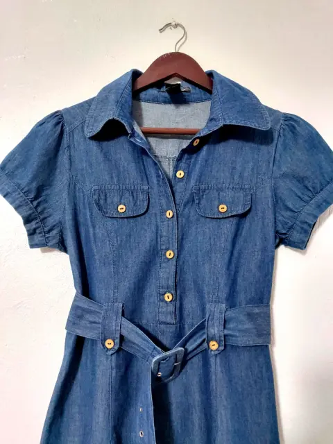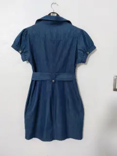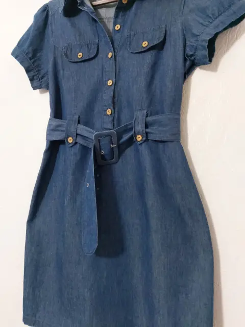 Vestido corto con cinturón. Luce muy belloTe va a encantar.Talla SEn buen estado y sin detallesNo tiene strech. Fiel a su talla.Incluye cinturón.Tiene cierre al costado.Tela tipo mezclilla.De axila a axila: 45 cmLargo: 83 cm.