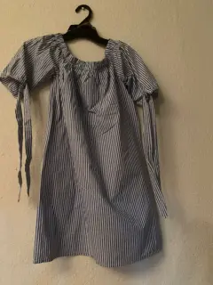 Vestido de algodón, corto, rayas azules y blancas, detalles de flores al frente y moños en las mangas, escote a los hombros