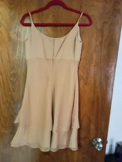 Vestido corto, corte A, falda en capas, tirantes de espagueti hermoso color melón, tiene forro por dentro y cierre en la espalda