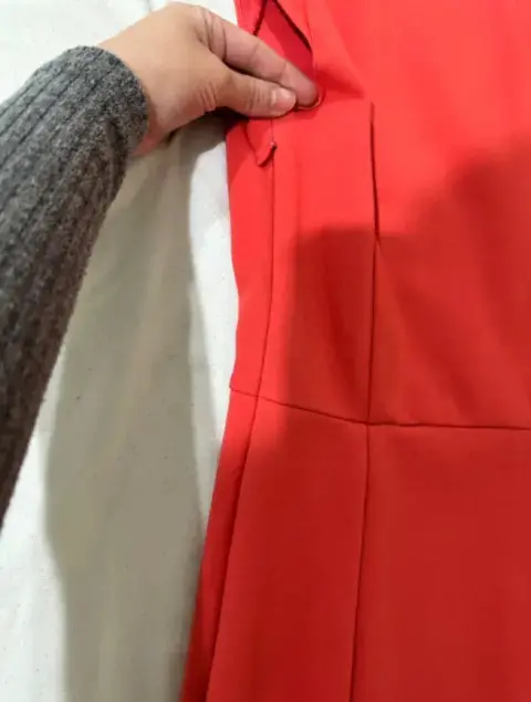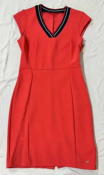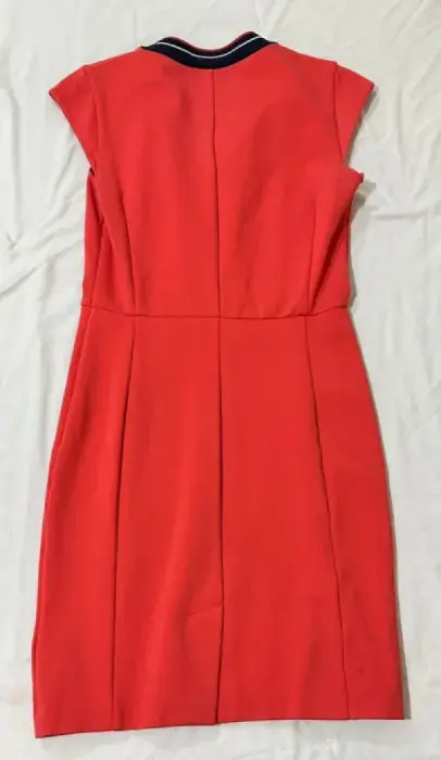 Vestido corto color coral con cuello en V, con cierre al costado, tela stretch.