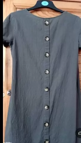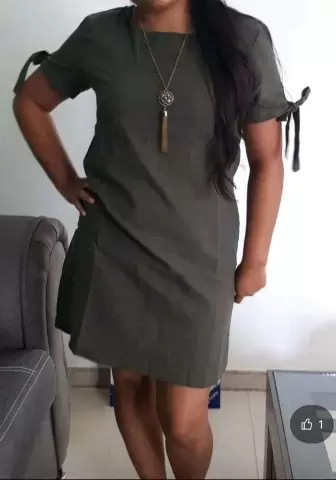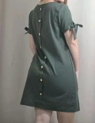Vestido corto cuello redondo. Vestido corto cuello redondo con botones traseros de adorno y cintas en mangas, color verde militar a estrenar!