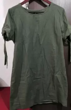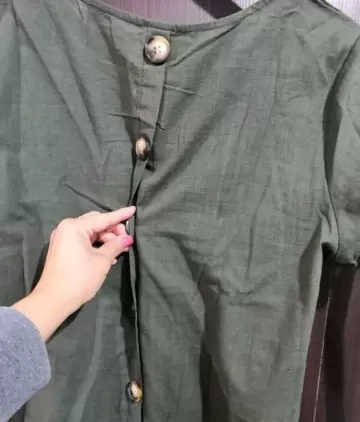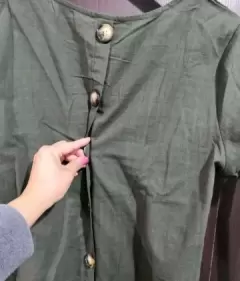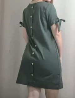 Vestido corto cuello redondo con botones traseros de adorno y cintas en mangas, color verde militar a estrenar!