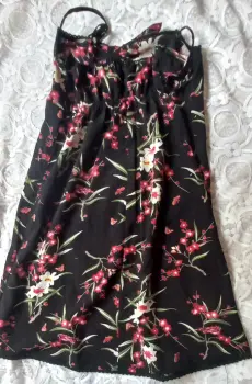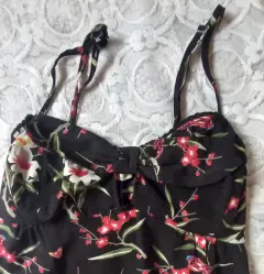 Vestido corto de cintas, hombros descubiertos. Vestido floreado, corto(arriba de la rodilla), con moño al frente. talla extra chica.