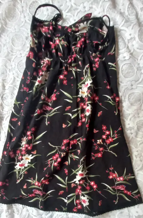 Vestido floreado, corto(arriba de la rodilla), con moño al frente. talla extra chica.