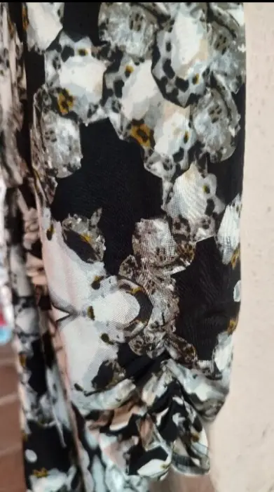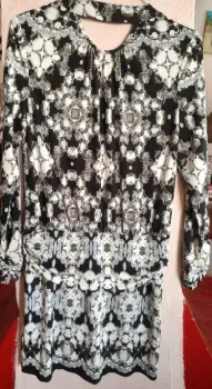 Vestido corto talla M, marca Caché, usado una vez; negro xon flores blancas, drapeado en la cadera