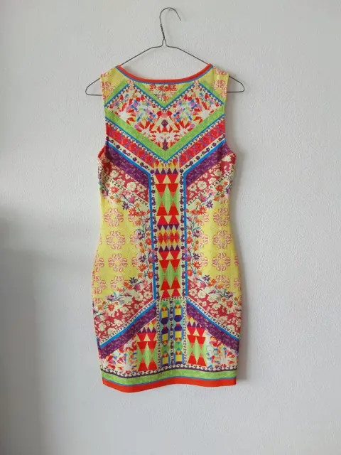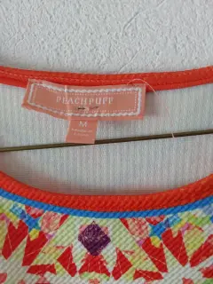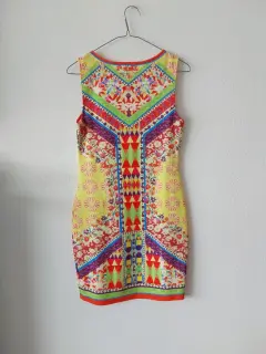 Vestido en tonos naranja, amarillo,verde, morado,azul rey y blanco. Corto al cuerpo.