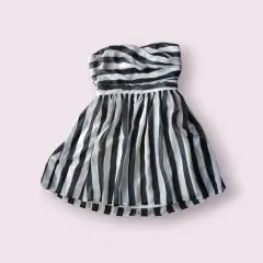 Vestido corto de gasa strapless. Vestido corto de gasa a rayas black & white.Straple drapeadoCierre atrásCopas preformadas.Medidas:Axila a axila: 38cmEl resorte de atrás mide 34cm sin estirar y estira hasta 44cmsTalle: 40cmLargo: 67cmTodas nuestras prendas van limpias y planchadas. Envío inmediato.