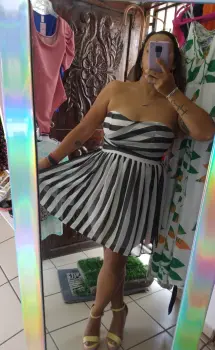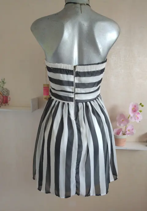 Vestido corto de gasa a rayas black & white.Straple drapeadoCierre atrásCopas preformadas.Medidas:Axila a axila: 38cmEl resorte de atrás mide 34cm sin estirar y estira hasta 44cmsTalle: 40cmLargo: 67cmTodas nuestras prendas van limpias y planchadas. Envío inmediato.