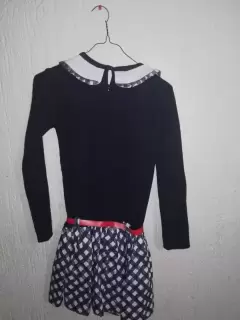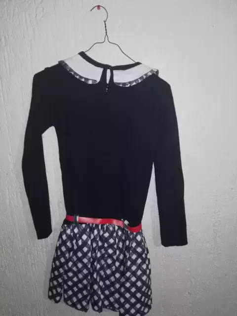 Es un vestido tipo chemise ,ven la parte superior tiene tejido de punto y en la parte inferior tiene tela a cuadros azul marino y blanco, tiene un cinturón con detalle de flor en rojo, cuello en blanco con detalles azules, muy bonito, es talla 14 y mide 80 cms de largo .