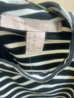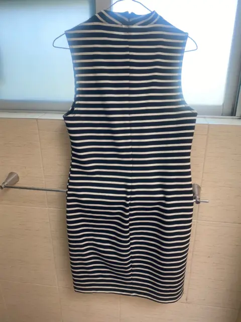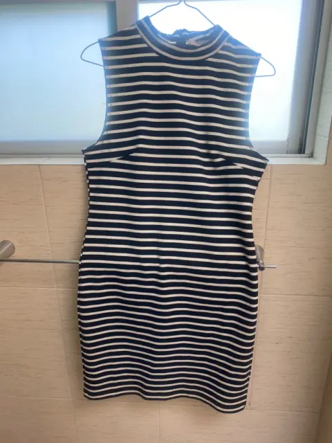 Vestido corto de rayas, blanco con negro. Vestido talla chico, corto pero de no es incómodo, la tela es súper cómoda y se amolda muy bien a tu cuerpo, el cuello es un poco alto así que si lo usas con una chamarra de mezclilla y tennis queda muy casual. Si lo usas con tacones queda Perfecto para una salida un poco más formal.