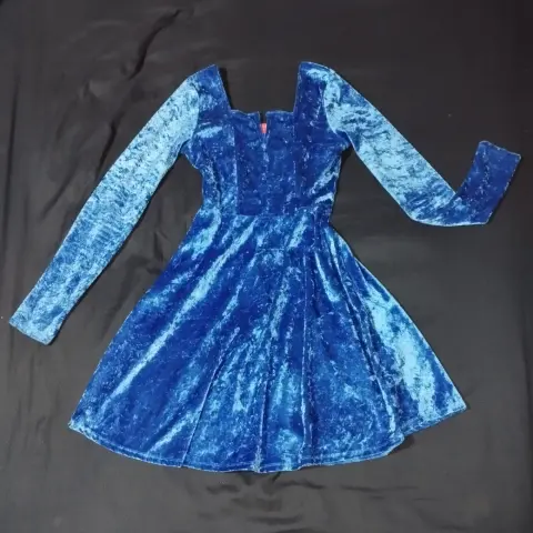 Vestido corto de terciopelo azúl brillante. Bonito vestido de terciopelo azúl brillante y suave de manga larga, escote cuadrado, en perfecto estado, sólo se usó una vez, se lava fácil, la tela no pica ni raspa, no transparenta, ajusta al cuerpo ya que estira, es talla M pero está un poco reducido, los accesorios no están incluidos. Haz tu oferta!