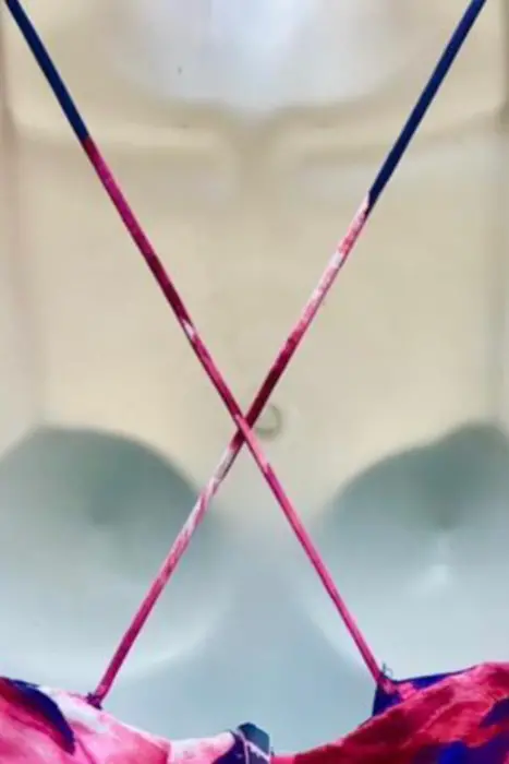 Vestido corto estampado con flores colores rosa y azul. Corte tipo A, con bolsillos. Tirantes cruzados en la espalda. Los tirantes están cocidos a mano, porque fueron reajustados. Vestido juvenil para fiesta en jardín o exteriores.