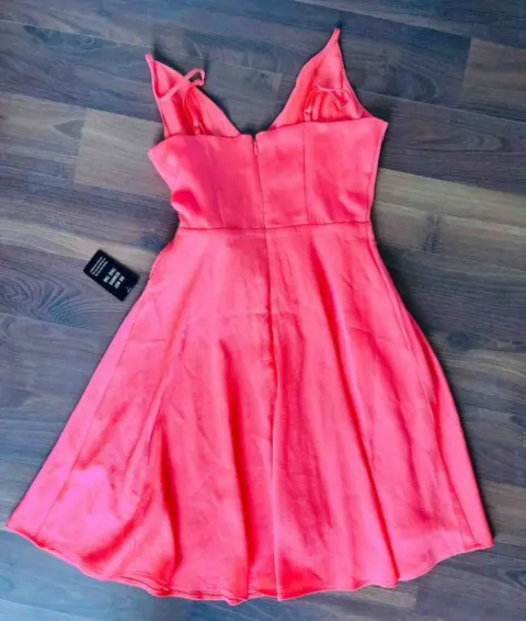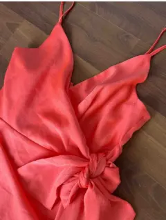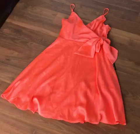 Vestido corto de fiesta color coral , con tirantes y detalle de moño adelante , tiene forro . Nuevo con etiqueta