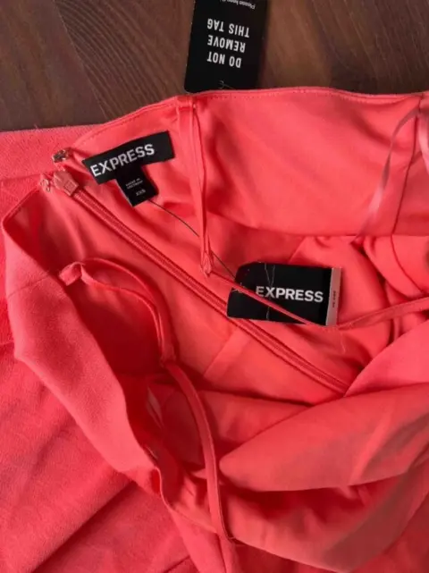 Vestido corto fiesta Express. Vestido corto de fiesta color coral , con tirantes y detalle de moño adelante , tiene forro . Nuevo con etiqueta