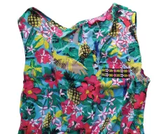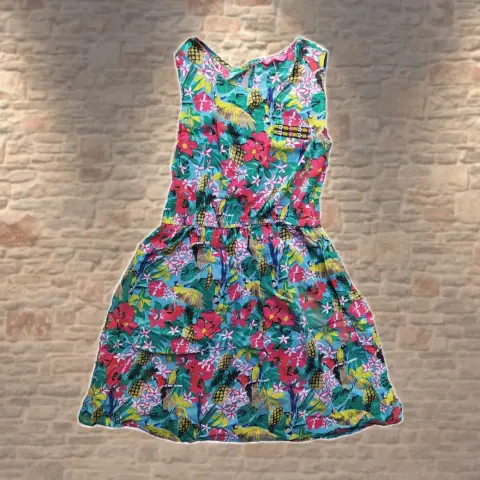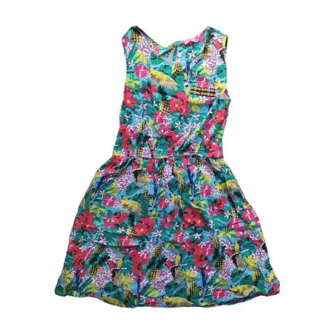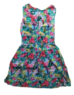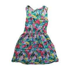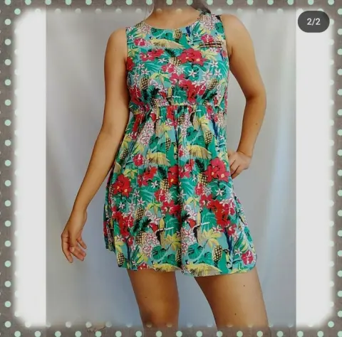 Hermoso vestido de flores, muy fresco y delgado para época de calor. Tiene resorte en la cintura, dice que es para niña pero queda bien a una talla CH de adulto.Hombro a hombro: 30 cm.Axila a axila: 38 cm.Largo total: 74 cm.Resorte en cintura 60 cm contorno.