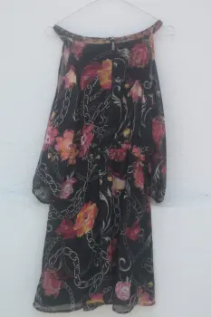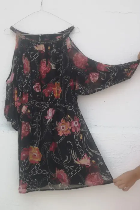 VESTIDO CORTO FLORES CON CUT OUT EN HOMBROS. Hermoso vestido floreado con hombros descubiertos, llega a la rodilla y la tela es de gasa con forro y cuentas y adornos en el cuello