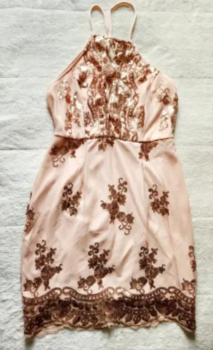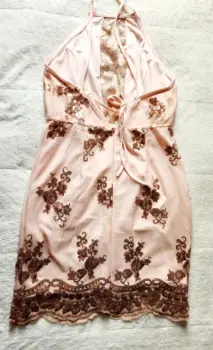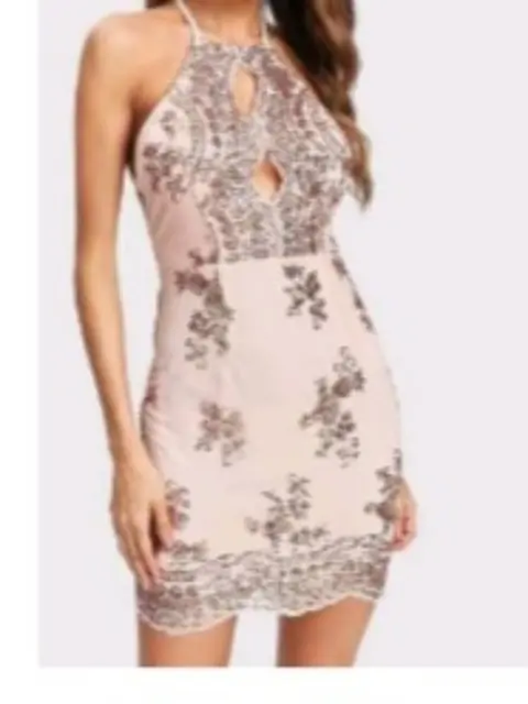 Vestido, formal, color Rosita, con detalles de lentejuelas, es halter con escote de espalda y delantero, es corto para evento en jardín, boda o coktail.