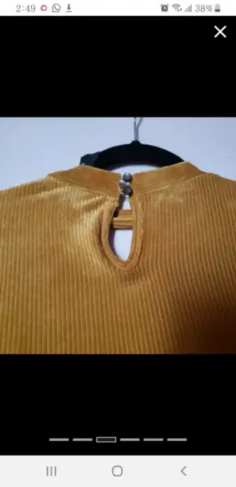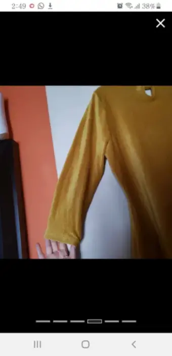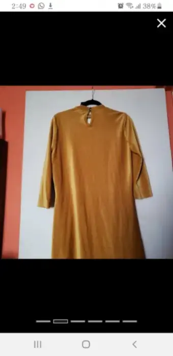 Vestido para tiempo frio/fresco tela gamuza, color mostaza, manga 3/4, escote pequeño parte enfrente, con botones parte del cuello, queda arriba de las rodillas.