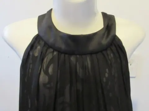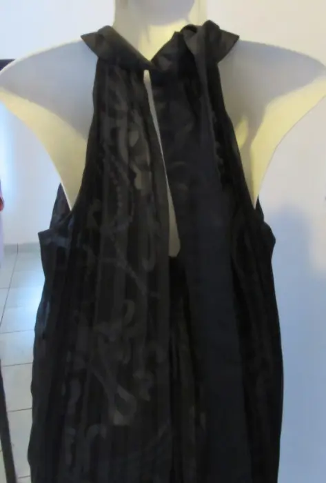 Detalles: Vestido negro de cuello redondo, sin mangas, con estampado, sin cierre; cuenta con un listón ajustable en la parte superior trasera del vestido. Medidas del productoPecho: 35 cmContorno de cintura: 34 cm Largo: 92 cmElasticidad: si Talla:M