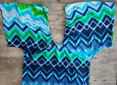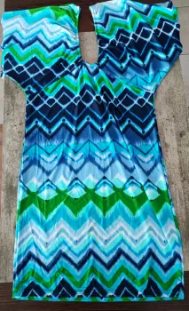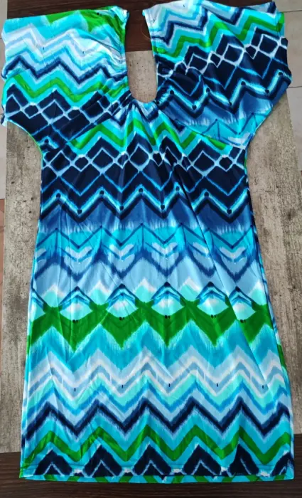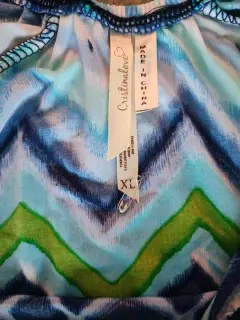 Vestido corto multicolor en color verde, azul y blanco.Ajustado cin maga ancha y resorte en pecho.Luce hermoso!Talla XLTela licra suave y fresaPuesto 1 vez sin detallesMedidas pecho 46 cms