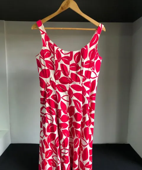 Vestido corto en blanco con flores fiucsa.Talla 6Tela stretchCierre en el costadoDa muy bonita forma en la cintura97% algodón, 3% spandex Se lava en secoMedidas: Axila a axila: 44 cmLargo: 94 cm