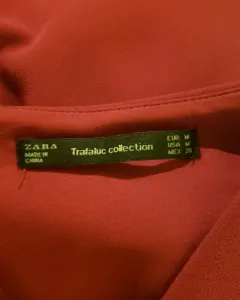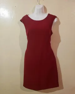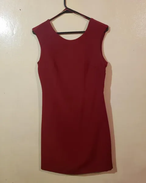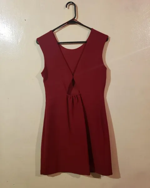 Vestido rojo, corto, sin mangas, abertura triangular la espalda