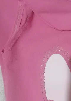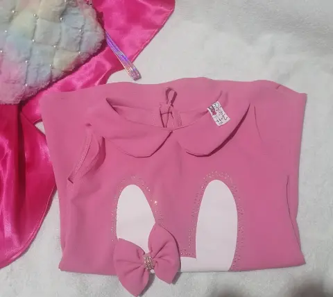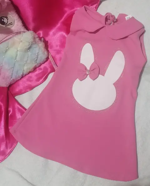 Vestido corto rosa. Vestido corte "A" para niñas, estampado de conejo, tiene un detalle en la pedrería, se le movieron unas, anexe foto y se jalo un poco el hilo de la parte de atrás, pero no se nota, aún así, a exe foto.