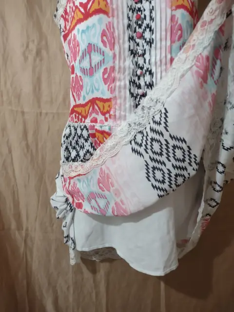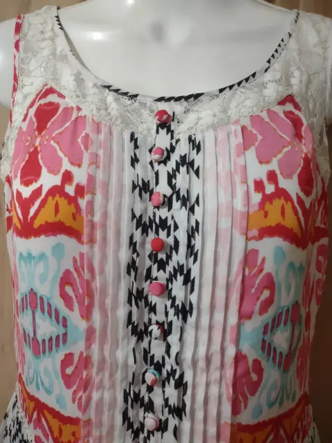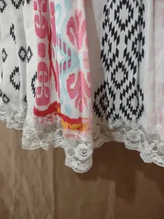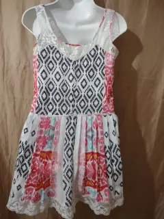 Coqueto vestido corto rosa con blanco. Nuevo, talla 0.Diseños geométrico y flores, rosa, blanco y rosa, tirantes de encaje y encaje en la parte de abajo.Botones d qué rno al frente, con cierre en un costado y con fondo.